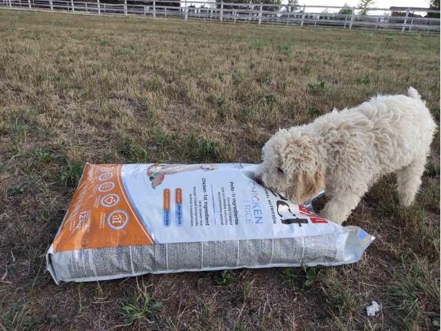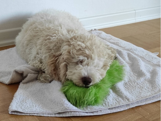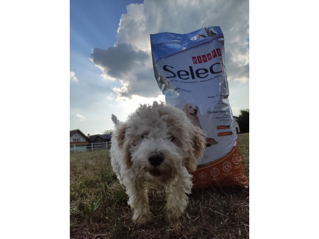 Ajka je pasme Lagotto romagnolo, v bistvu trenutno en mali puhasti kodrček. Pri svojih rosnih 3. mesecih potrebuje hrano za mladičke Select Puppy in seveda kakšno zanimivo igračo West Paw Custer.