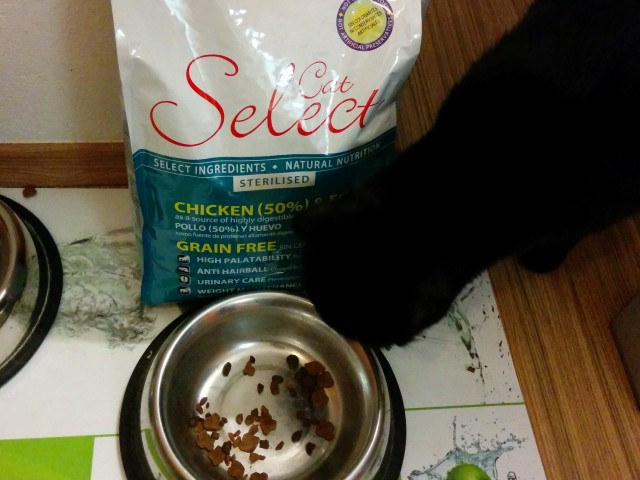 Mucka Sophie je začudena nad prazno posodo. Namreč pri zelo zbirčnih muckah je posoda hitro prazna.